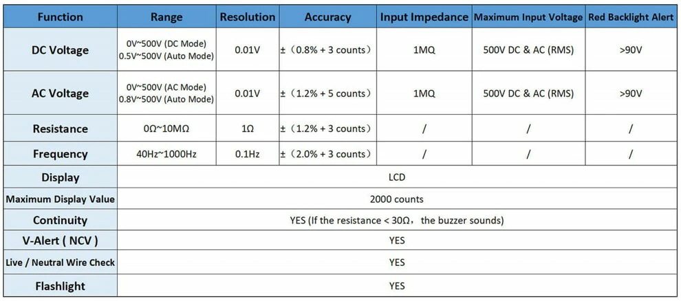 1MQ500V DC és AC (RMS) >90VAC feszültség0V ~ 500V (AC mód) 0.8V ~ 500V (automatikus mód)