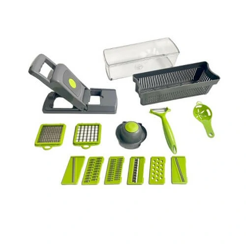 A termék 14 tartozékkal rendelkezik, amelyekkel különböző méretű és formájú gyümölcsöket és zöldségeket vághat. Ezek a tartozékok kiváló minőségű anyagokból, például rozsdamentes acélból és tartós műanyagból készültek, így biztos lehet benne, hogy a termék hosszú ideig fog tartani.