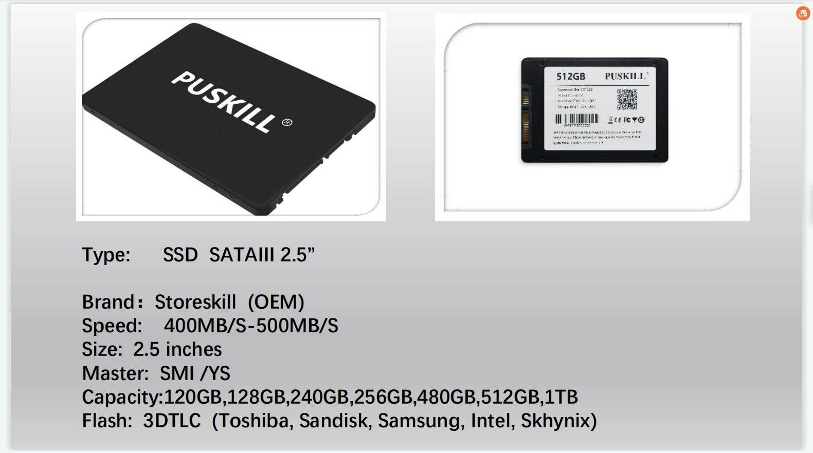A PUSKILL SSD-ket 6 Gbps-os interfésszel és TLC NAND flash memóriával tervezték. Akár 550 MB/s és 500 MB/s olvasási és írási sebességet kínálnak. Ezek a meghajtók kétféle kapacitással kaphatók: 256 GB és 512 GB, és kompatibilisek a legtöbb operációs rendszerrel és SATA-interfésszel.